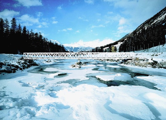 Pontresina é uma vila alpina com uso sazonal intenso de sua infraestrutura de mobilidade, especialmente para atividades de inverno. A ponte foi projetada em 1997 como uma solução temporária e reutilizável, sendo instalada e removida anualmente.